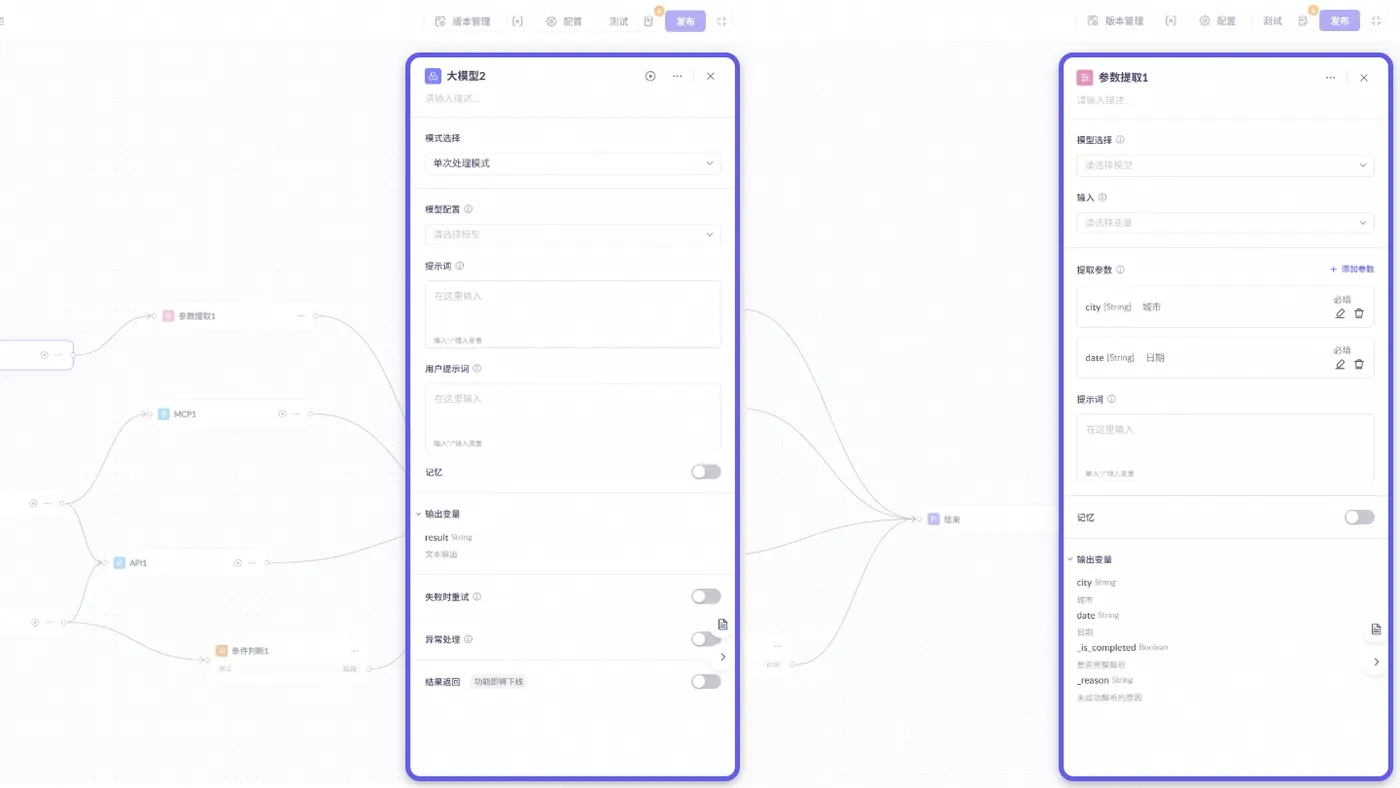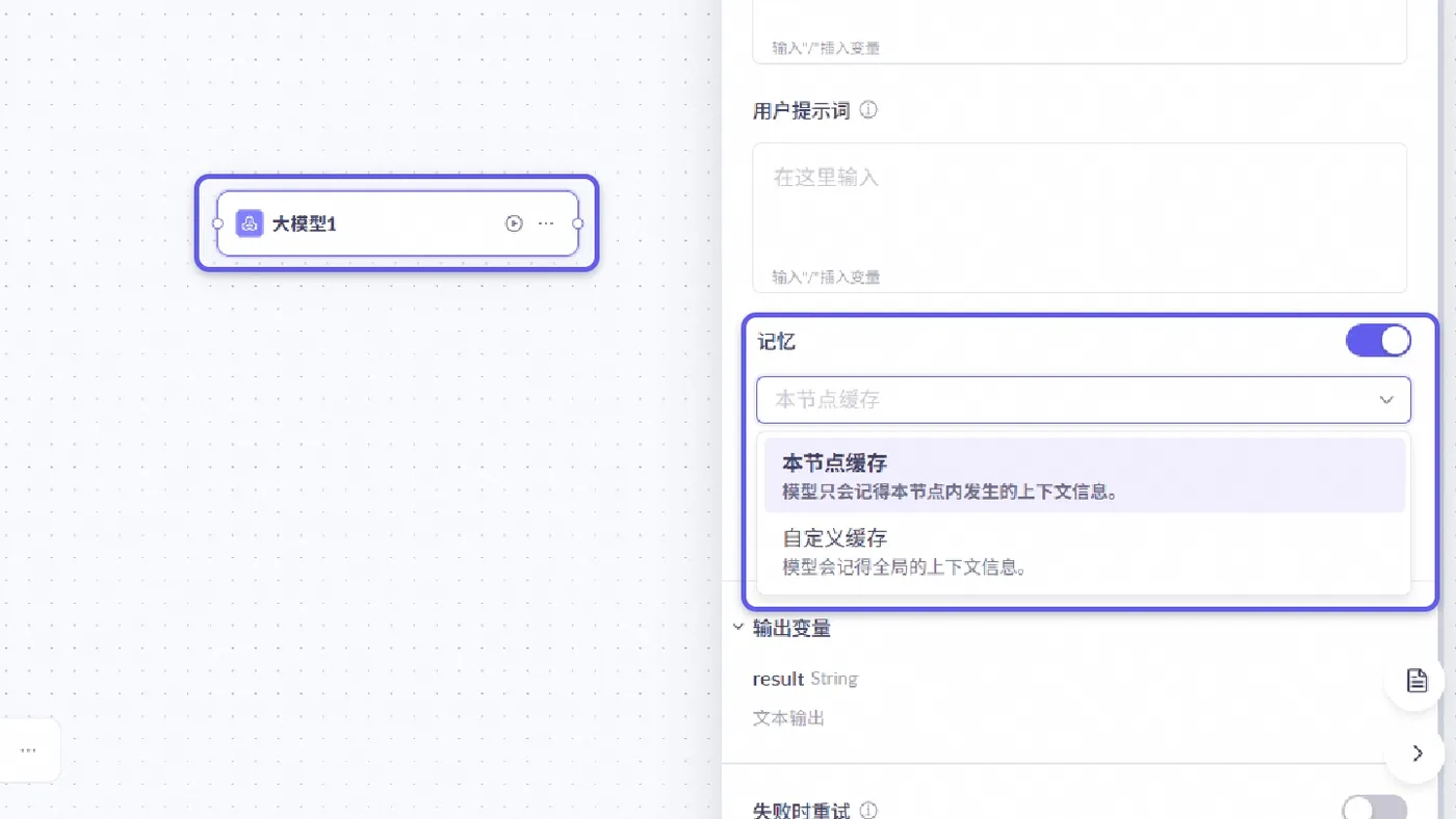 大模型节点支持配置记忆方式:本节点缓存(仅记录当前节点内容)或自定义缓存(记录所有上下文),满足不同模型对记忆范围的需求。