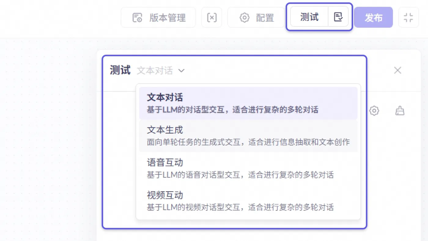 原来的对话型与任务型模板合并,测试窗根据类型自动切换为文本对话或文本生成等4种模式。