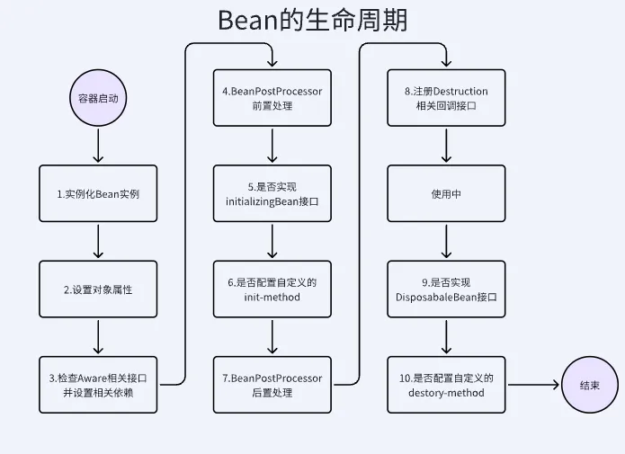 4.销毁:第8~10步,第8步不是真正意义的销毁(因为下一步才正式使用),但是在这一步会注册销毁的相关调用接口,在第9、10步真正的销毁bean时执行对应的方法