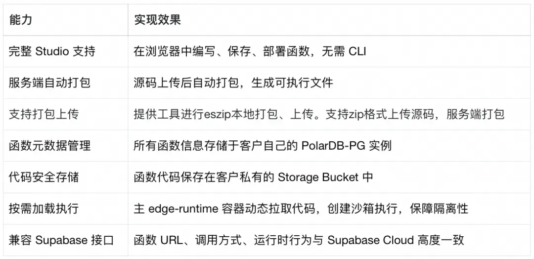 因此,PolarDB Supabase 在 公有云托管环境 下,采用 独立实例(Isolated Instance) 架构,并自主研发轻量级 FaaS 管理系统,成功补全了开源版 Supabase 缺失的最后一块拼图 - Edge Functions。