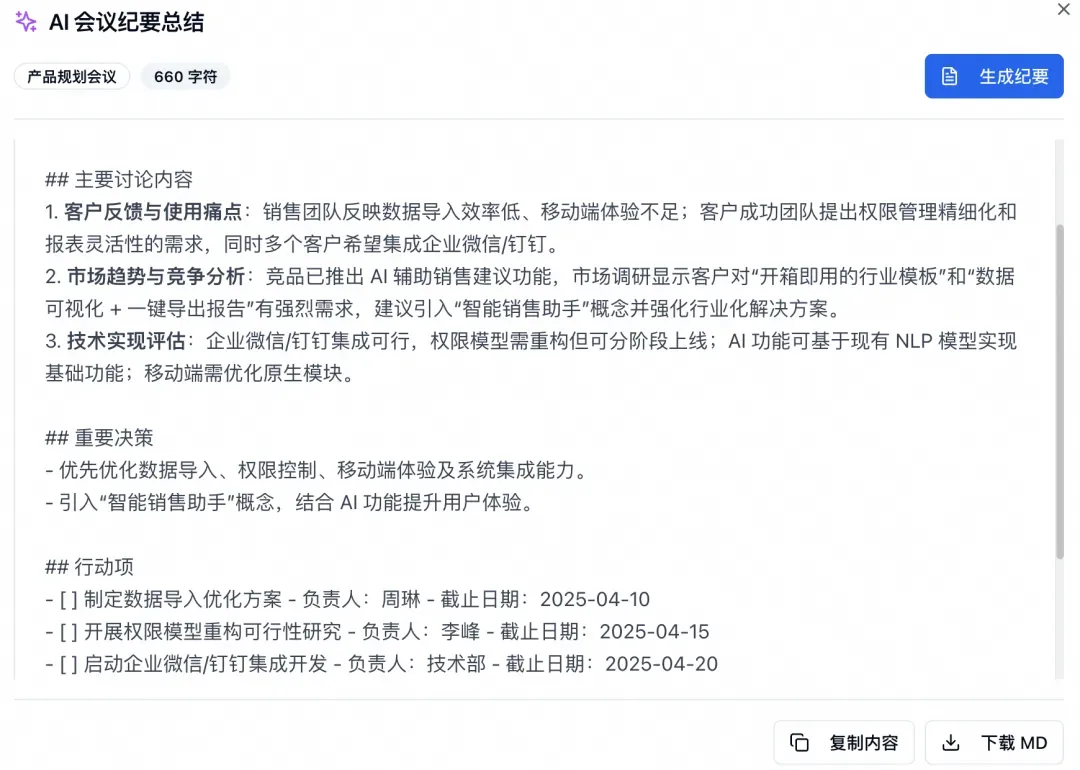 5. 进入会议,填写一些会议内容,点击AI纪要总结。前端会请求 Edge Functions 函数,利用通义大模型生成会议纪要,效果见下图: