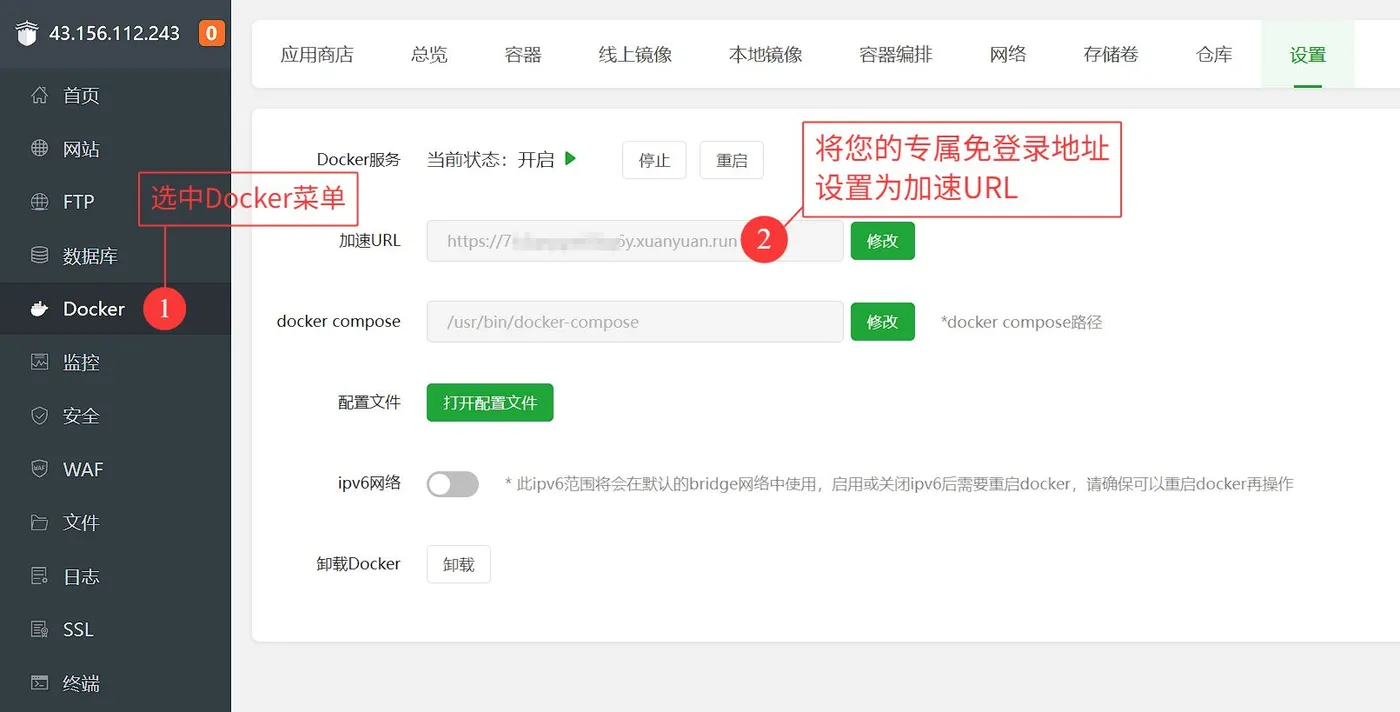 宝塔Docker加速配置界面