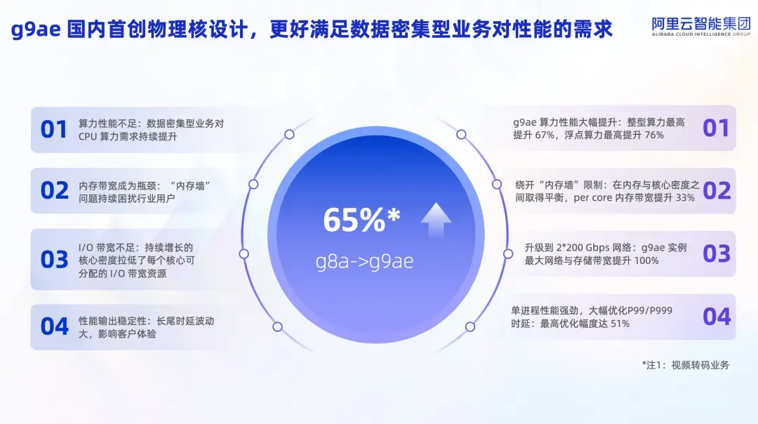 此次跟随u2实例一同发布的,还有第九代ECS旗舰产品AMD企业级实例 g9ae,性能最高提升了65%。g9ae聚焦大数据、搜推广、视频转码等数据密集型业务,可解决内存带宽、I/O带宽不足的行业痛点。
