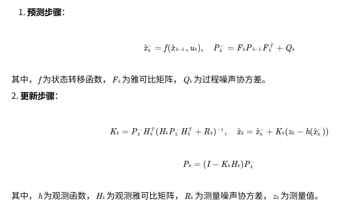- 状态估计:利用EKF或UKF递归更新状态估计与协方差。