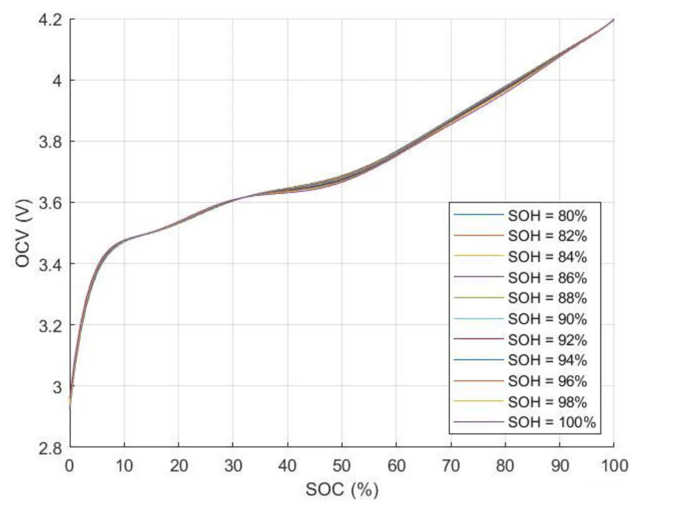 - 恒流充放电实验:以1C速率充电至4.2V,静置1小时;以1C速率放电至2.5V,记录OCV-SOC曲线。