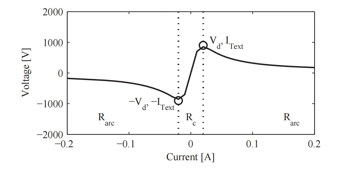 从宏观角度来看,电路中的放电电压和电流的演变如图1所示。这个图被称为静电放电特性[12] [15] [22] [33]。我们可以将这个特性分为三个独特的区域(如图1中的点线所示)。一个区域包括在电压-𝑉_𝑑和𝑉_𝑑之间。这个区域对应于静电特性的阻性部分。在这种情况下的放电是发光放电或熔化桥。因为两者都是阻性的,我们用Rc表示这个区域的电阻。另外两个区域在电压-𝑉_𝑑和𝑉_𝑑之外,对应于电弧放电。在这种情况下,电弧电阻不仅仅是一个简单的电阻,而且还取决于电弧电流。我们用Rarc表示这些区域的电阻。电压𝑉_𝑑被称为击穿电压,而IT ext是相应的电流。