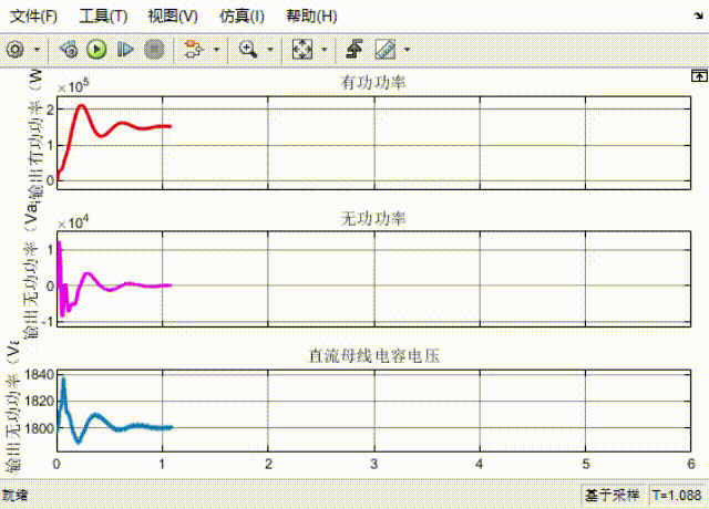 在仿真中,有功功率在第2秒从150KW阶跃至180KW,无功功率在第4秒从0Kvar阶跃至3000。这些变化表明系统能够无静差跟踪给定值,并且直流母线电容电压能够稳定在设定值。