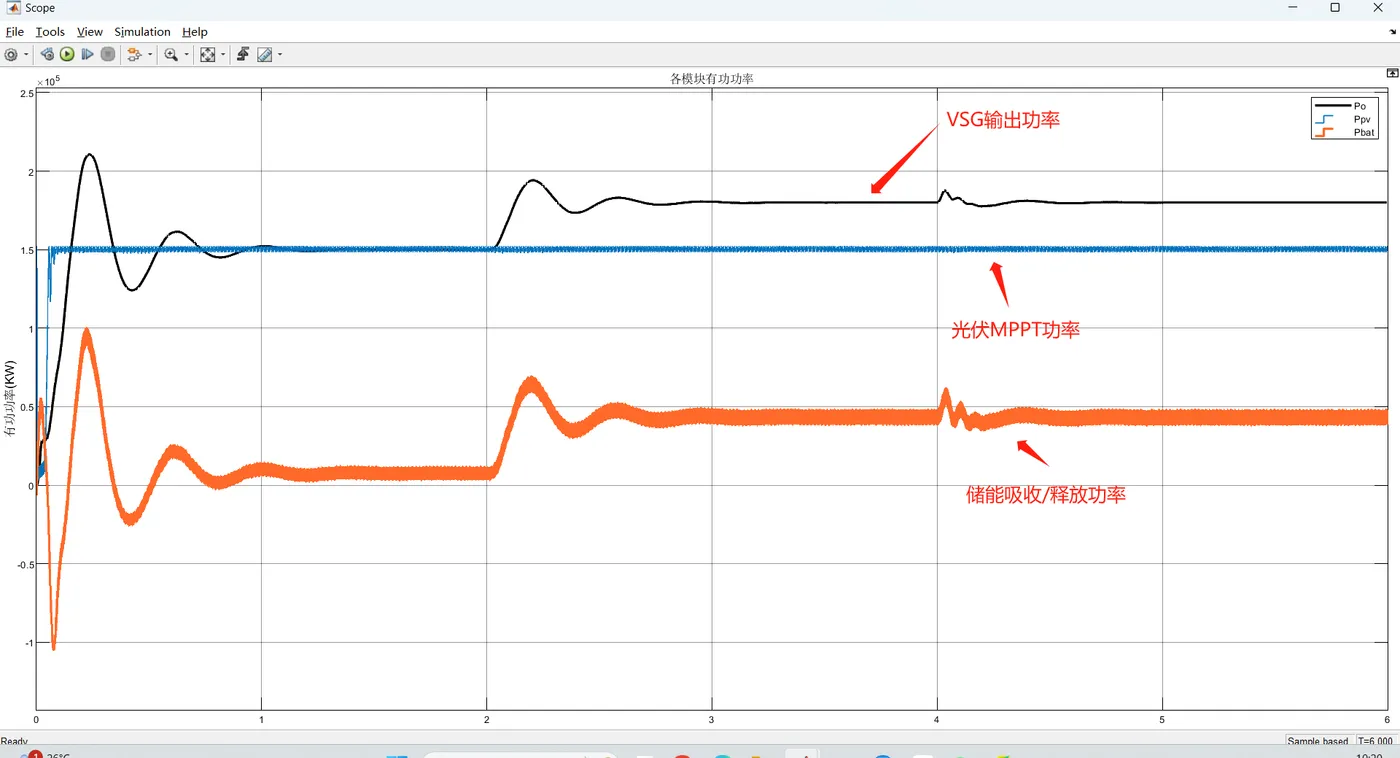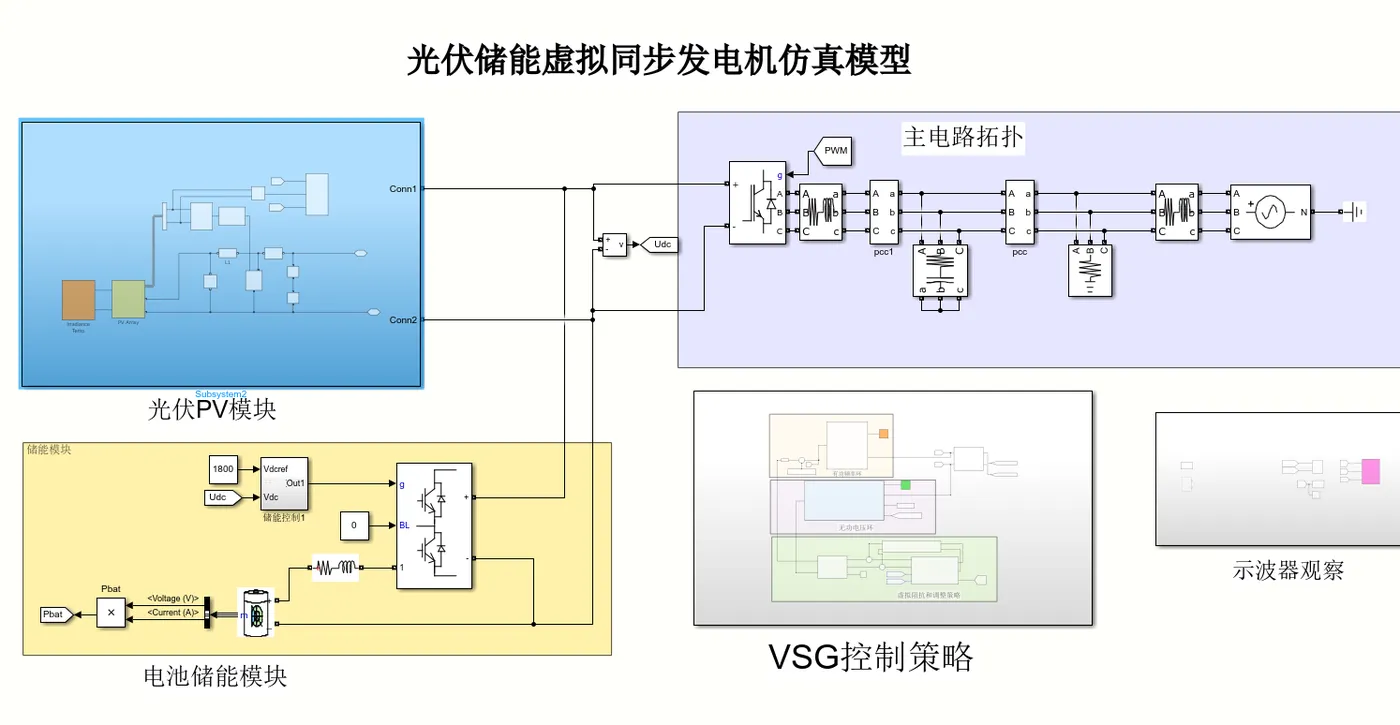 - 模型结构:光伏组件→DC/DC变换器→储能→VSG逆变器→电网。
