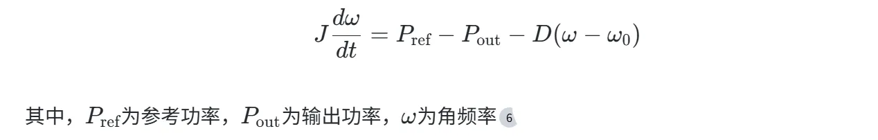 - 转子运动方程:描述虚拟惯量(JJ)和阻尼系数(DD)对系统动态响应的影响,公式为: 编辑