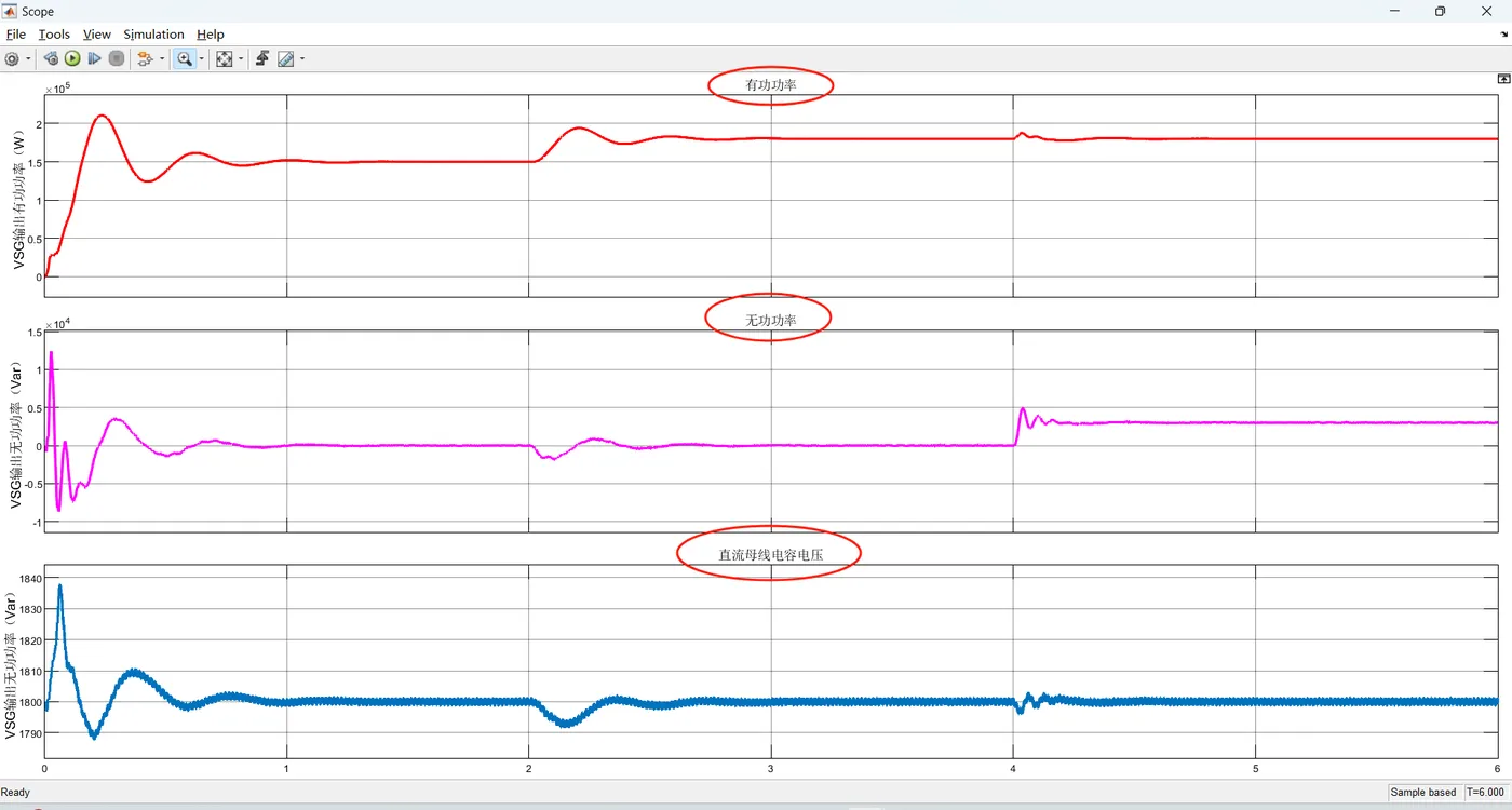 多台VSG并联时,需解决有功环流问题。通过等效频率模型分析,调整虚拟惯量和阻尼系数,实现功率均分。 - 动态响应特性