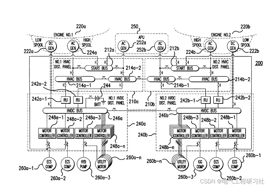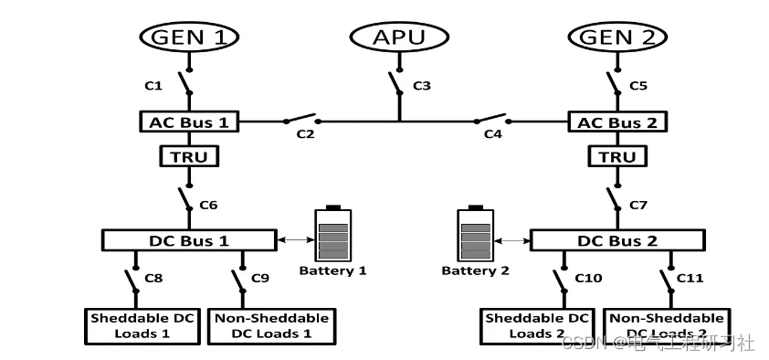 不同组件之间的连接由单线图 (SLD) 指定,这是一种表示三相电力系统的简化符号 [1]。交流和直流发电机为许多交流和直流负载或电力转换设备(例如变压器和整流器单元)供电。除了连接到飞机发动机的发电机外,发电元件还包括辅助动力装置(APU)和电池。电力通过一条或多条总线分配,发电机与负载的连接通过一系列机电开关(称为接触器)进行布线。一部分负载很关键,无法卸载,而其他负载可以在紧急情况下脱机。最后,电流、电压和接触器传感器用于监控系统状态并识别可能的故障。
