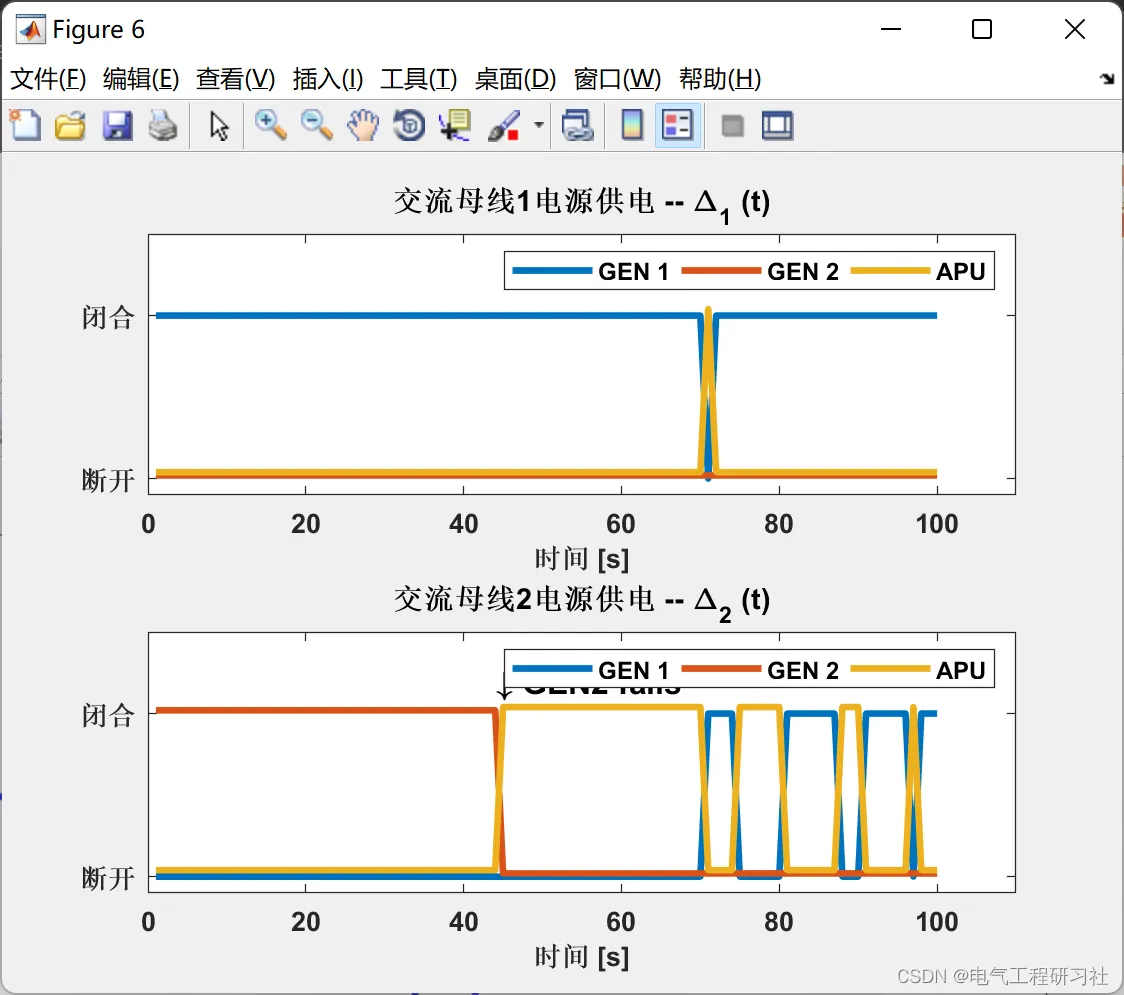 飞机电力系统 (EPS) 是安全关键系统,可为起落架或飞行控制执行器等重要负载提供电力。随着一些液压、气动和机械部件被电气部件取代,现代飞机 EPS 变得越来越复杂,因为硬件子系统数量更多以及它们与嵌入式控制软件的交互 [1]。电力系统的电气化允许实施智能控制技术,通过对电力资源的优化管理来实现更高的性能和整体效率。然而,今天的 EPS 设计主要遵循顺序衍生设计过程,其估计早期设计决策对最终实施的影响的能力有限(最初由德国 DoD1 为国防应用开发的 V 图的变体)。为了降低开发过程中的风险,新开发的设计通常是旧飞机 EPS 的转世,由于当今的飞机需要大量新功能,这种做法注定很快就会停止,我们的方法建立在许多结果的基础上,这些结果为更正式的 EPS 设计方法开辟了道路。在 [4] 中,作者提出了一个通过仿真对飞机子系统进行建模和架构探索的平台。类似地,在 [5] 中,作者利用飞机的飞行动力学模型与驱动系统模型耦合来利用仿真。虽然已经报道了几种用于电力电子、开关和转换器的优化技术,但优化整个配电系统的问题在文献中很少受到关注。在 [6] 中,确定了网络各个点的最佳电压和功率水平,以最小化总重量、安装成本和燃料消耗。在 [7] 中提出了一种遵循 PBD 范式的面向优化的 EPS 设计方法。然而,[6] 和 [7] 的主要关注点是发电机的选择和拓扑的设计,即不同 EPS 组件之间的互连,而不是 EPS 接触器开关逻辑的优化设计和负载管理。在 [8] 中讨论了 EPS 控制协议的正确构造设计的自动化程序。系统规范首先使用线性时序逻辑 [9] 进行转换,然后通过利用形式化方法自动合成以保证安全约束。然而,虽然最终解决方案的正确性得到保证,但它在许多性能指标方面的最优性,例如使用的发电机数量和卸载负载,并没有得到解决。