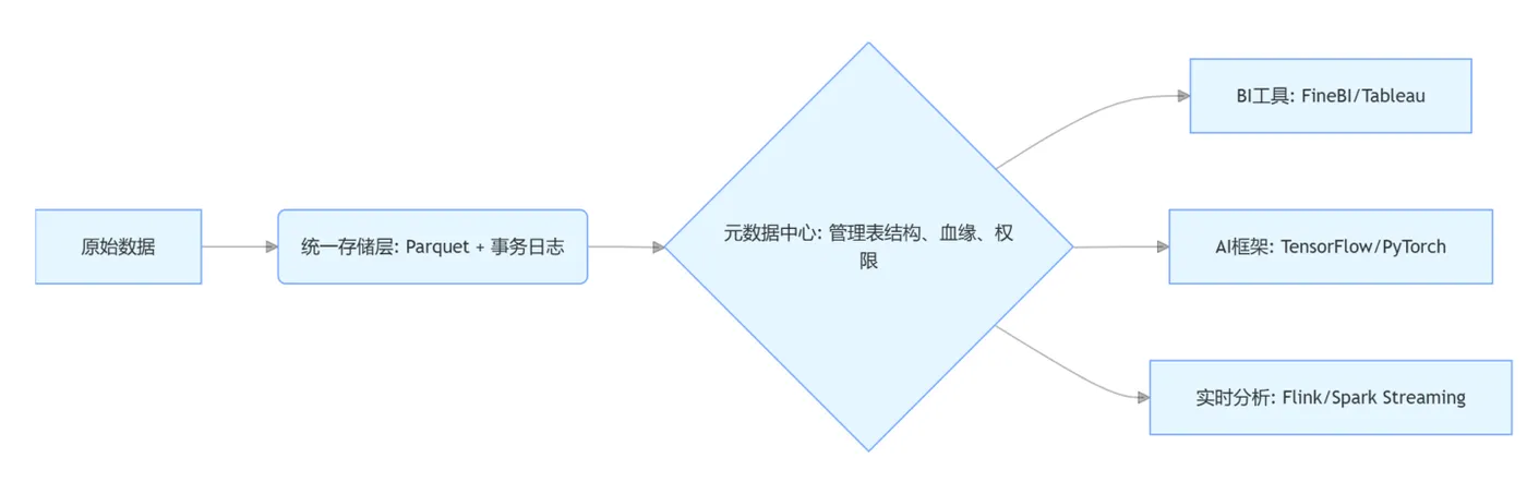 (1)一份数据多场景复用:报表分析与AI训练共享同一数据源,避免数据不一致。