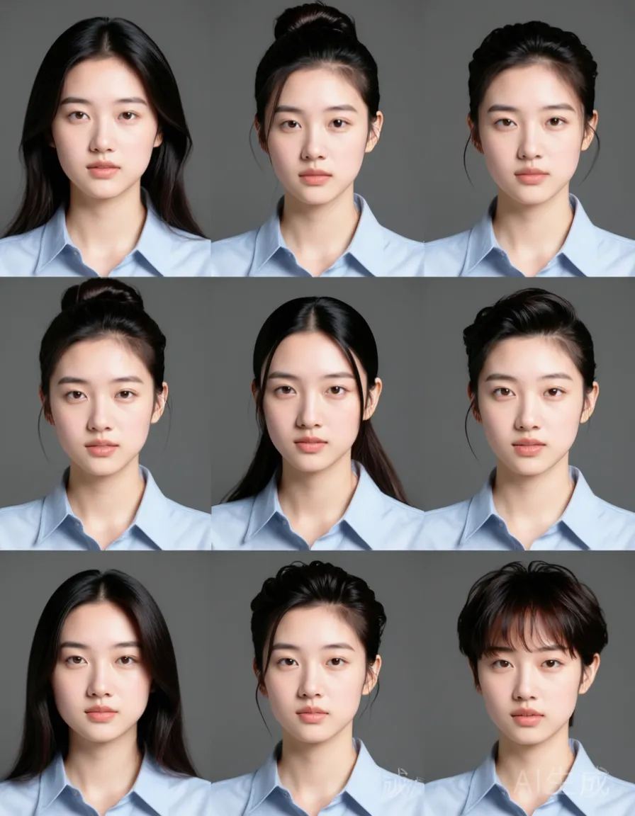 为图中人物设计9种不同的发型,展示该人物搭配每种发型的特写镜头,身穿淡蓝色衬衫,并整合输出为一种九宫格图片。 |