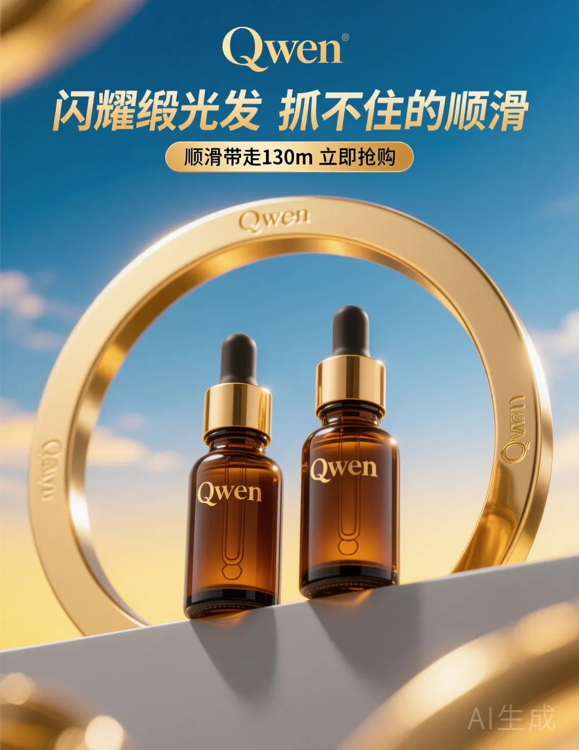 画面背景有高端灰金色宽圆环上有Qwen钢印,两瓶Qwen棕色玻璃瓶精油,会有渐变蓝天与暖黄天空过渡的背景,产品占据画面中心产品尺寸占比80%,商业海报拍摄手法,超近距离拍摄产品,产品摆放位置符合电商海报需求,拍摄产品角度为低角度仰视拍摄,黄金分割构图法+前景虚化+引导线纵深,3d立体效果,全息投影,顶部显示“Qwen”标识,主标题:闪耀缎光发 抓不住的顺滑,副标题:金色底圆框“顺滑带走130m 立即抢购”,文案文字优化排版+杂志级字体间距+出血线控制 |