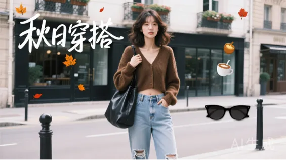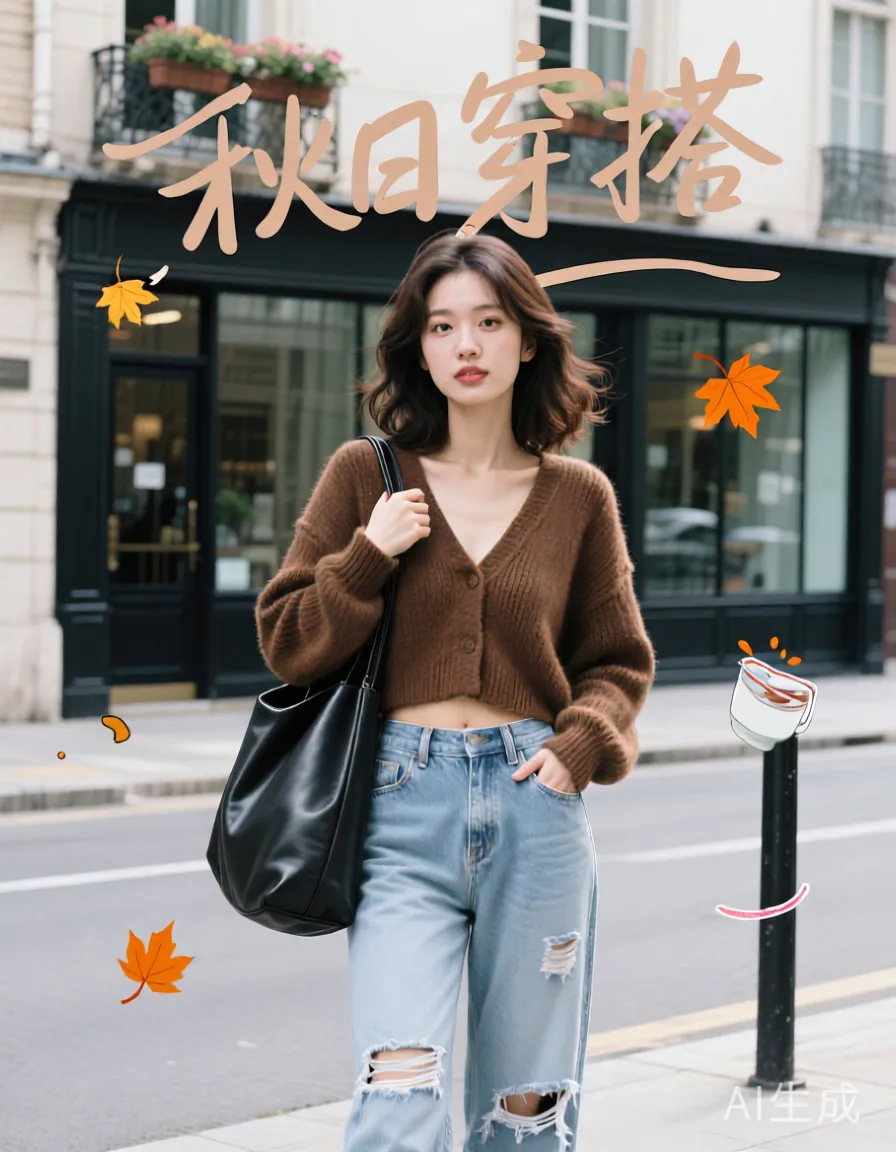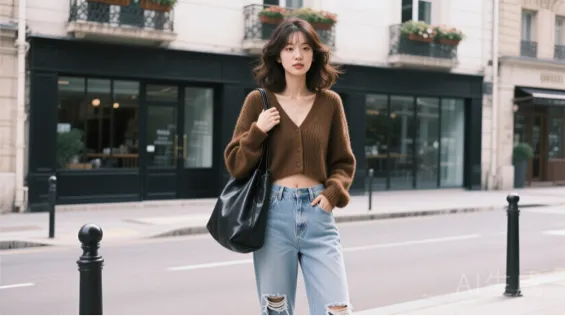 打造一位年轻女性在都市街头的时尚穿搭写真场景,展现韩系松弛感日常氛围 服饰: 上衣:棕色V领宽松针织开衫,版型偏短款、面料有轻微毛绒感 下装:浅蓝色高腰破洞牛仔裤,膝盖处做旧撕裂设计,裤型为直筒微阔腿 配饰:黑色软质皮质大包,随意搭在手臂上 动作: 自然站立姿态,一只手插牛仔裤口袋,另一只手轻握皮包,身体微微侧向镜头,营造随性不刻意的松弛感 发型: 中长发,黑棕色自然发色,微卷带点空气感,刘海轻薄、发丝有自然散落的动态(体现微风轻拂的氛围感 ) 背景: 都市街头场景,后方是简约欧式建筑底商,有大面积玻璃门窗、黑色金属装饰,上层搭配复古阳台花箱,地面为浅灰色柏油路面,搭配经典黑色街道路桩 光线: 自然光质感,模拟阴天或柔和午后光,整体亮度均匀,无强烈明暗对比,突出清透、柔和的氛围 角度: 平视角度拍摄,镜头与人物身高基本平齐,完整展现全身穿搭及背景环境,增强日常纪实感 氛围: 韩系ins风松弛感,传递“毫不费力的时尚”,带着都市生活的悠闲与随性,仿佛是博主日常出街随手拍 风格: 轻时尚穿搭博主街拍风,融合韩系简约美学与都市日常感,色调偏自然柔和的胶片质感 ,突出穿搭细节与生活氛围的融合 。 |