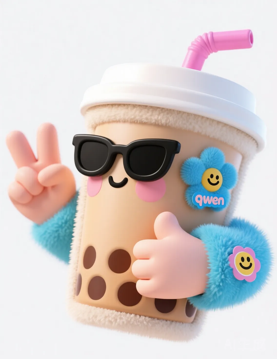 3D潮玩角色设计,主视觉为奶茶杯,毛绒绒布材质,配色明亮饱和度,白色杯盖,粉色吸管,奶茶装饰,黑色墨镜表情,侧边点缀笑脸花朵和蓝色毛绒“qwen”贴纸,一只手从奶茶背后探出比耶,另一只手(嘻哈界常用赞的手势)。整体造型夸张可爱,突出奶茶主题的尺寸感与趣味性,背景为纯白色,构图为仰角大特写视角,画面饱满,适用于夏日IP主视觉、电商KV、玩具包装图等。 |