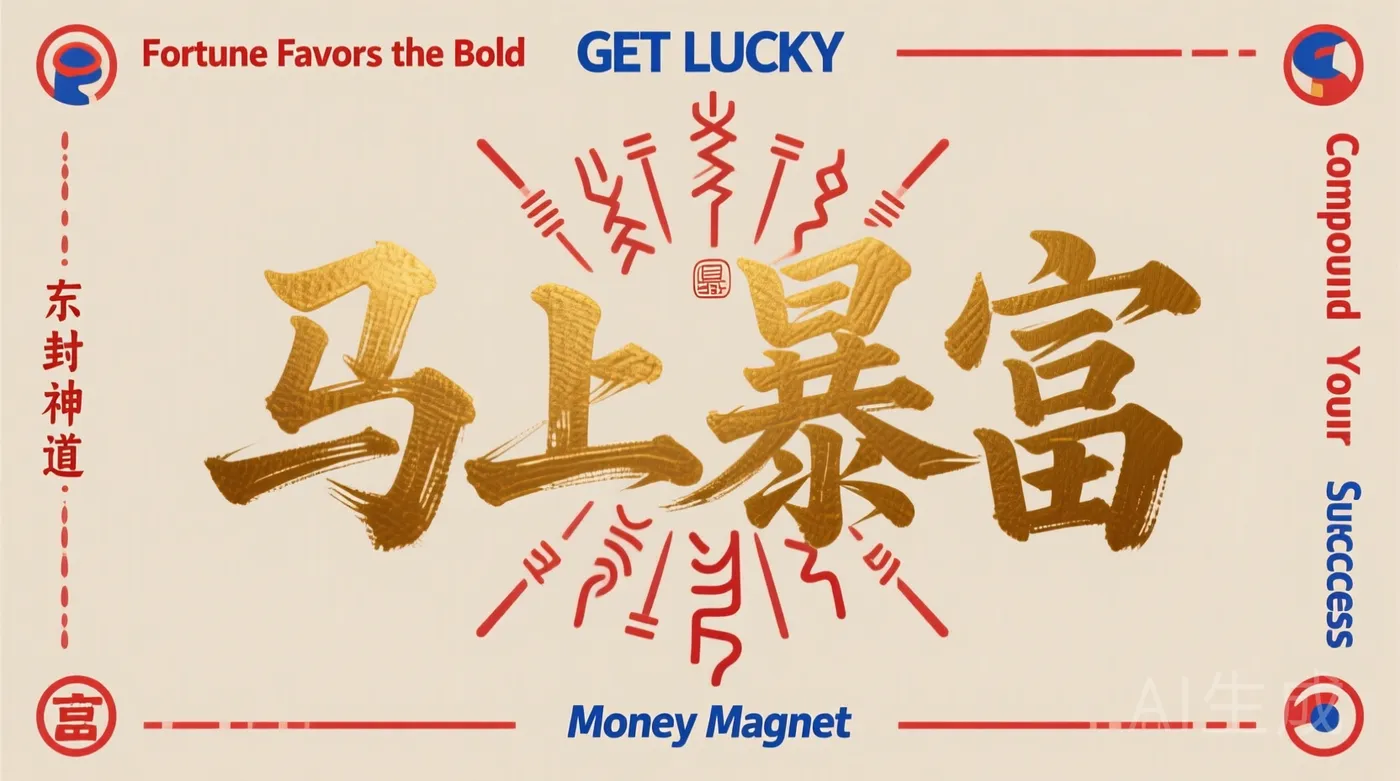 米色背景,最上方有英文“GET LUCKY”,中间是东方符箓字体、金色的“马上暴富”,文字灵感源于道家神秘灵符笔画,有玄术封印、夸张笔触、咒语结构线条,排布对称神秘,用金墨渲染并配有红色和蓝色,四周有装饰性英文“Fortune Favors the Bold”、“Money Magnet”、“Compound Your Success”,古东方玄学风,神秘、现代简洁氛围,细节丰富修饰 |