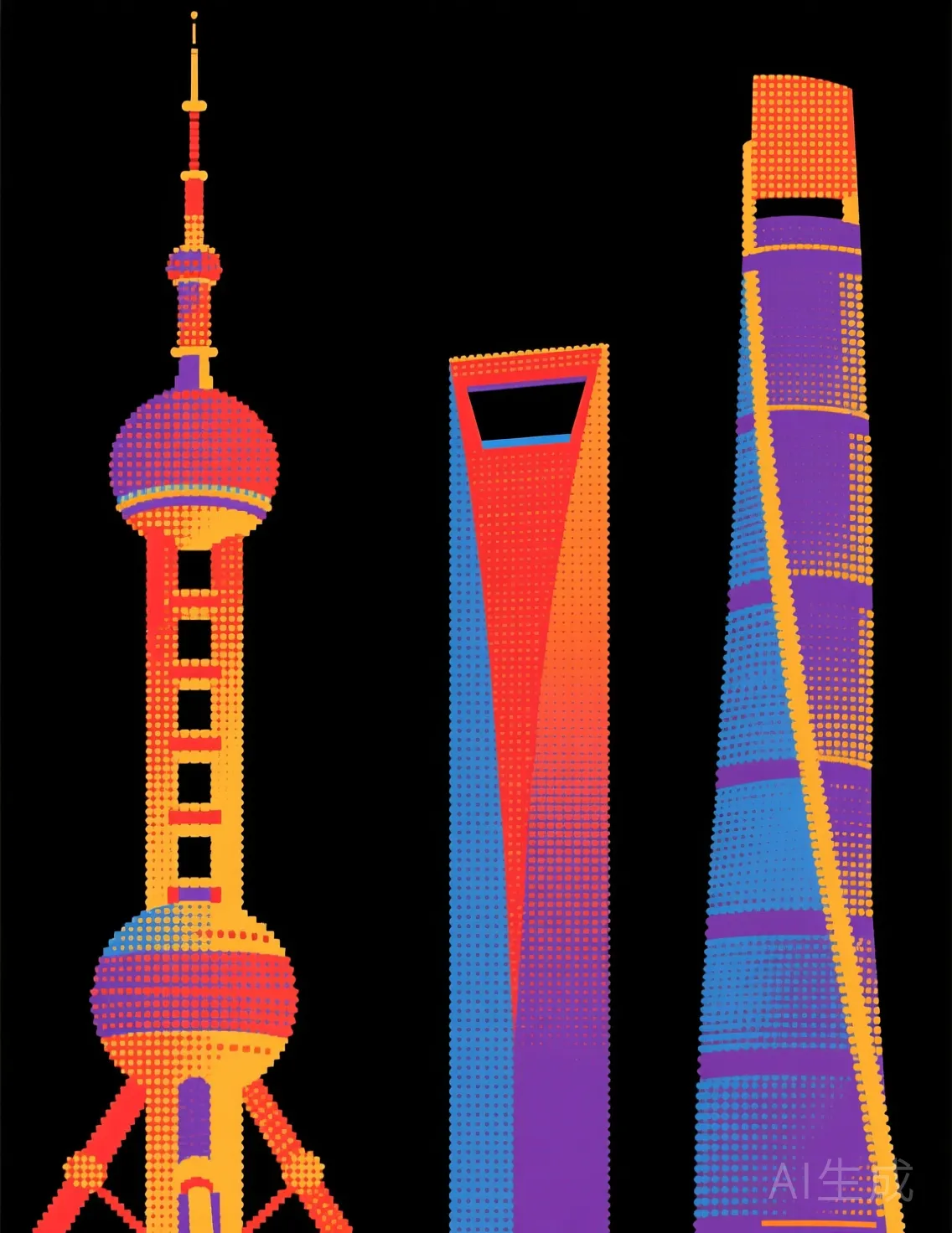 上海东方明珠浦东三件套,平视视角,采用点阵图案设计,红橙黄蓝紫配色,用密度差展示图像内容中的不同结构,不重叠的点阵,大师结构逻辑,最佳品质,排版设计,点阵艺术风格,商业矢量作品,黑色背景 |