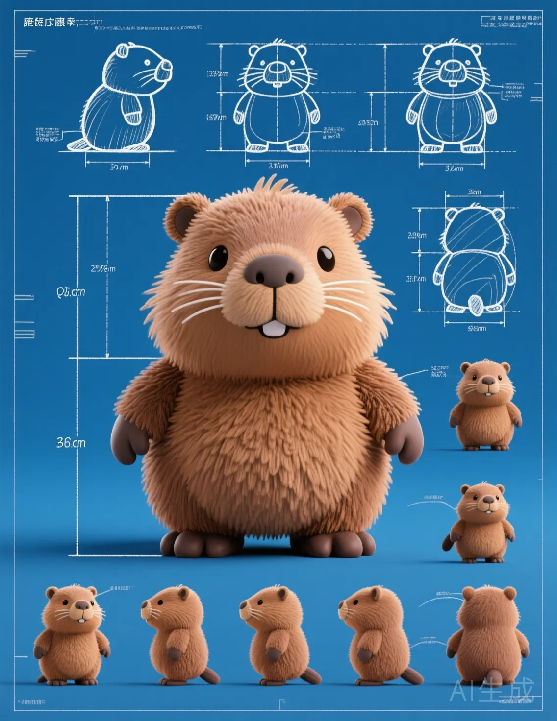 以蓝图的风格制作Q版棕色的卡皮巴拉,吉祥物玩偶,毛茸茸,设计草图。并包括尺寸和解释性文本注释。应使用线条和测量值来指示各个部位的尺寸,给草图以技术和详细的感觉。除了主要设计外,还包括显示不同角度的零散缩略图,立体景深 |