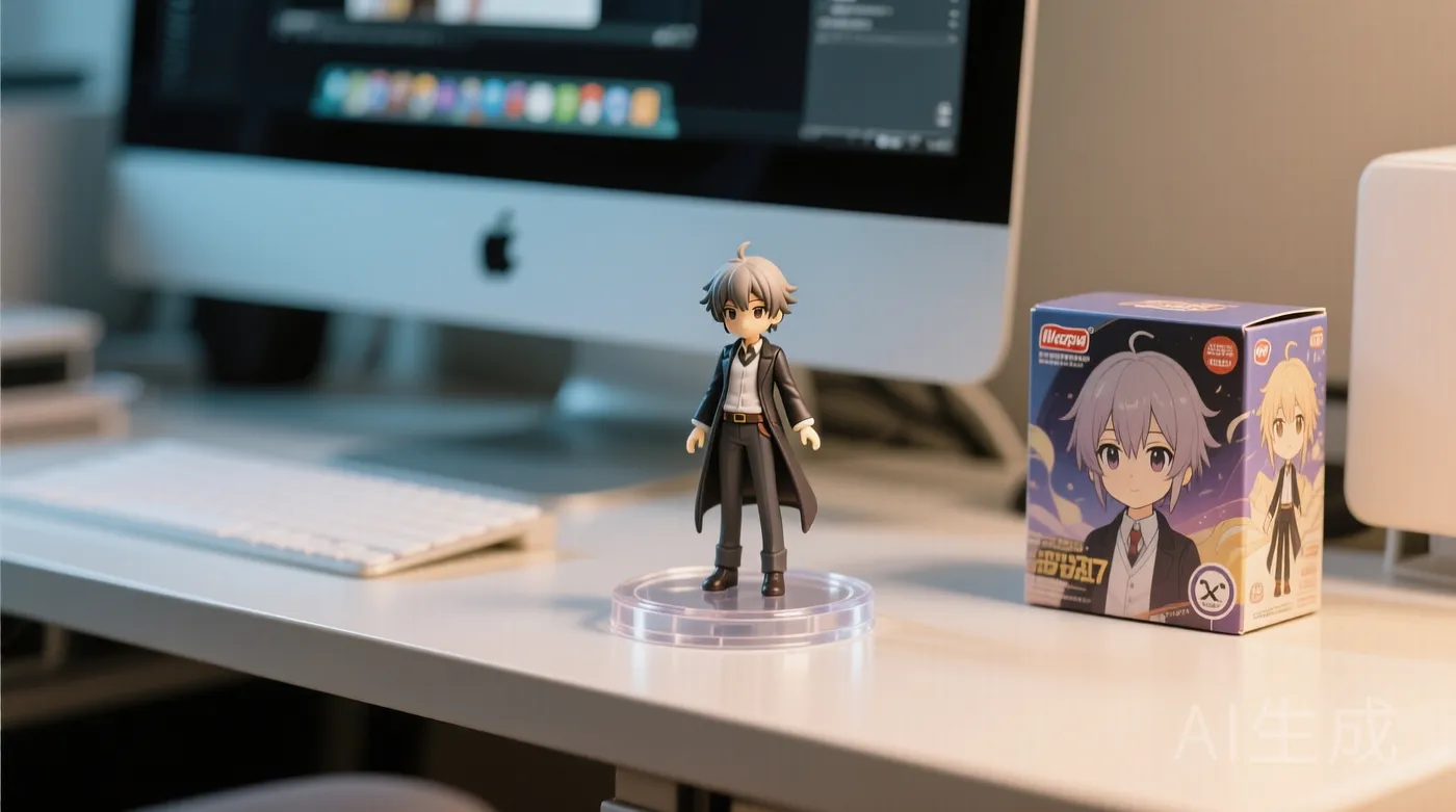 绘制这张图中角色的1/7比例商业化手办,写实风格,真实环境。手办摆放在电脑桌上,配有圆形透明亚克力底座,底座上午无文字。电脑桌旁边放置一只印有原画风格插画的精美玩具包装盒。 |
