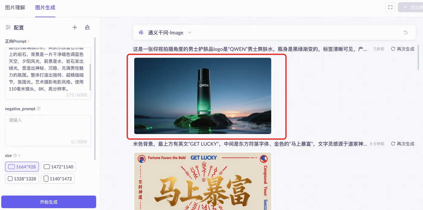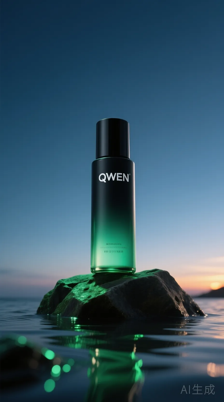 这是一张仰视拍摄角度的男士护肤品logo是“QWEN”男士爽肤水,瓶身是黑绿渐变的,标签清晰可见,产品是瘦长圆柱的玻璃瓶形状,爽肤水放置在水面上的岩石,背景是一片干净暗色调蓝色天空,夕阳风光,前景是水,岩石发出绿光,营造出神秘、沉稳、充满男性魅力的氛围。整体打造出独特、超精细细节,氛围光。艺术摄影电影风格。使用110毫米镜头,8K,高分辨率。 |