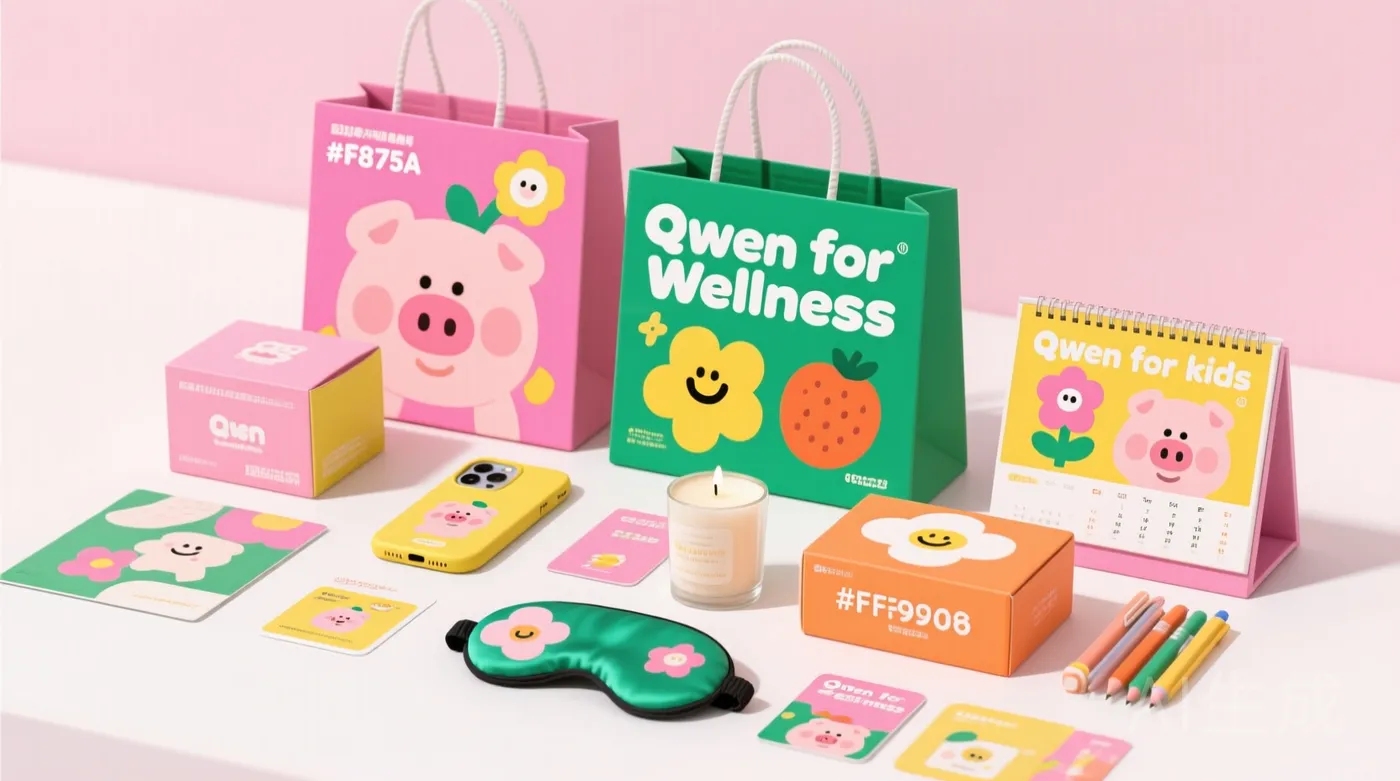 儿童文创品牌包装设计,童趣文创风格。以粉#F875AA、绿#32CD32、黄#FFD700、橙#FF9966 等明亮马卡龙色为主,搭配可爱可爱猪猪,花朵、笑脸、水果图案。涵盖手提袋、手机壳、眼罩、卡片、蜡烛、包装盒、文具、日历、展示牌等多样物品,突出“Qwen for kids”“Wellness” 等圆润可爱字体文字。营造轻松愉悦、充满童真活力的氛围,契合儿童品牌定位,白色或者粉色背景 |