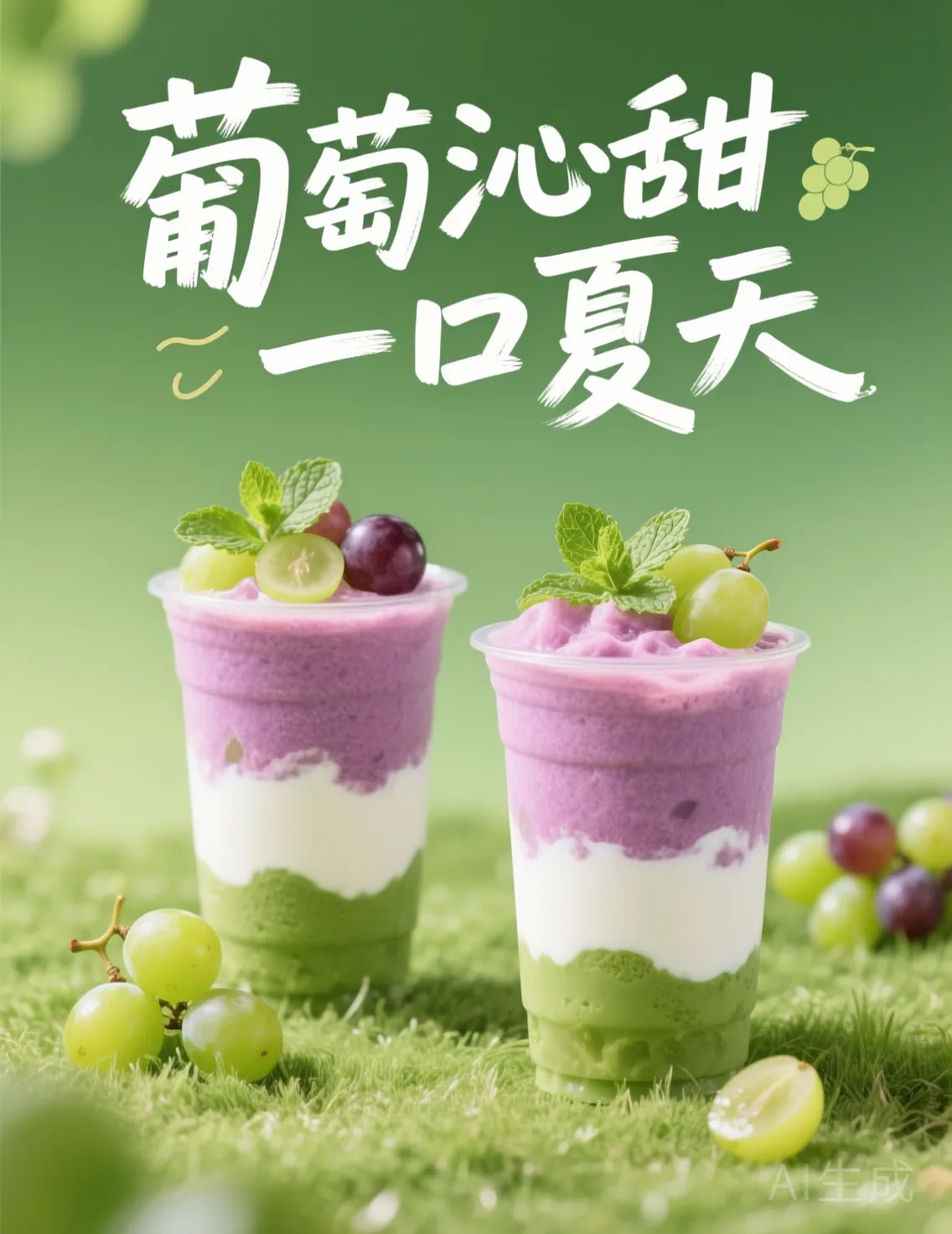 绿色渐变草地背景,营造清新、自然、治愈的户外氛围,传递青春活力夏天的感觉。两杯分层的葡萄风味饮品,上层是粉紫色葡萄冰沙,中层有白色酸奶层,下层是绿色的基地(葡萄果肉、抹茶等的颜色),杯顶点缀薄荷叶、真的葡萄果肉,并搭配新鲜葡萄、青提,强化整张海报的葡萄主题和新鲜果茶的质感。大字标题“葡萄沁甜 一口夏天”,用手写字体。 |