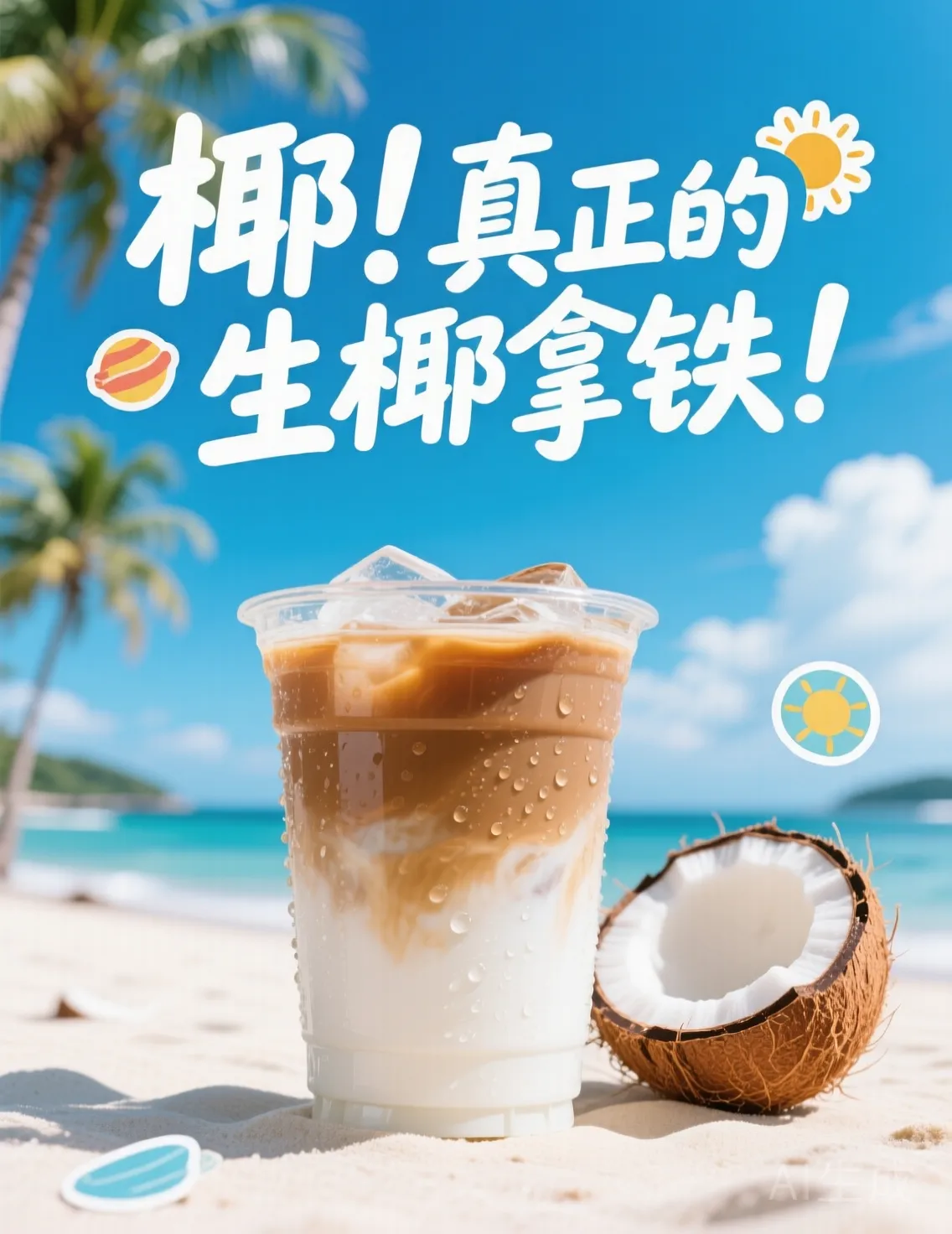以蓝天、白云、白沙滩、棕榈树等元素构建夏日海岛氛围,传递度假、清爽、活力感。一杯生椰拿铁饮品,透明杯身呈现分层,杯壁水珠强化饮品的冰爽感,搭配椰壳呈现生椰的原料。大字标题“椰!真正的生椰拿铁!”,采用艺术手写字体,白色为主,位于画面上方,活泼醒目,搭配夏日元素贴纸点缀。 |