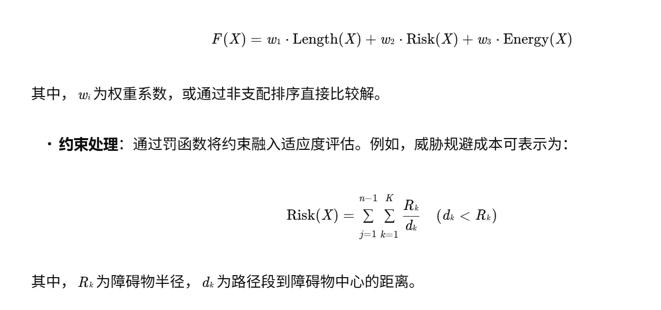 - 适应度函数:整合多目标加权或帕累托支配关系。例如: