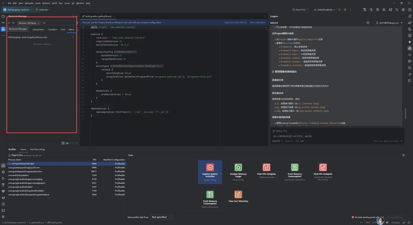 根据你提供的上下文,你的项目包含多个模块(包括gallerylibrary),需要分别查看每个模块的资源: