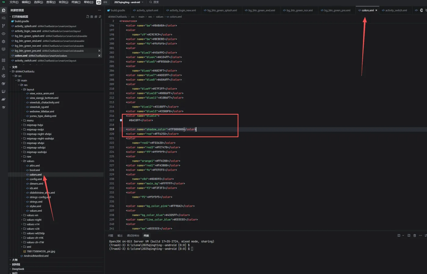 原生项目复杂就复杂于就算一个颜色的改动可能都比较麻烦,不像普通web项目或者vue项目,其次原生项目安卓Android的环境配置是很复杂的,很多人 第一步可以搞一周 甚至一个月都搞不成功,再次之前说了可以用trae辅助我们编程,但是真正的开发和调试还是得Android studio 离开Android studio 原生安卓项目也是没法运行的,至少trae满足不了,vs要满足也比较麻烦,本篇改颜色和主页图标,本项目代码 毫不夸张的说 就是WhatsApp的初期代码,历史大概有15年了。
