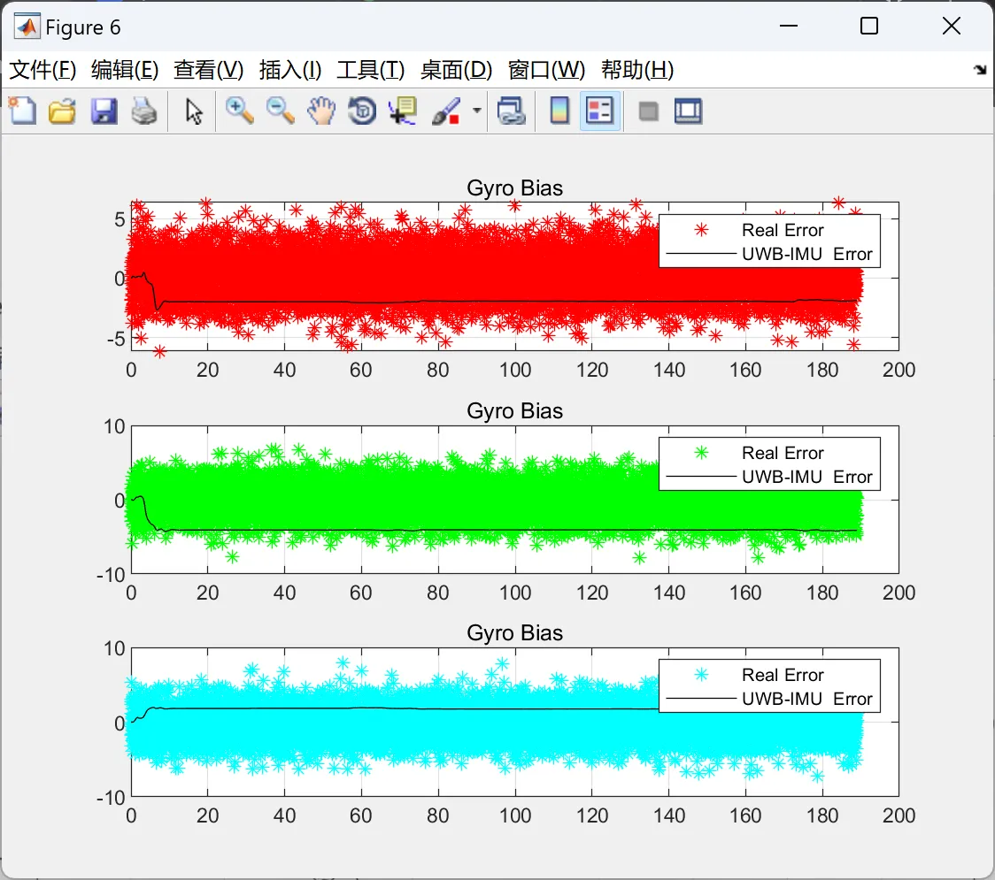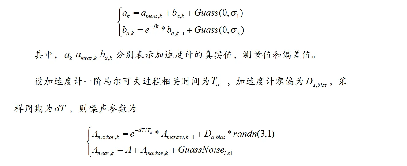 IMU的误差模型采用一阶马尔科夫噪声模型,将加速度计和陀螺仪噪声建立为高斯白噪声和Guass-Markov噪声。