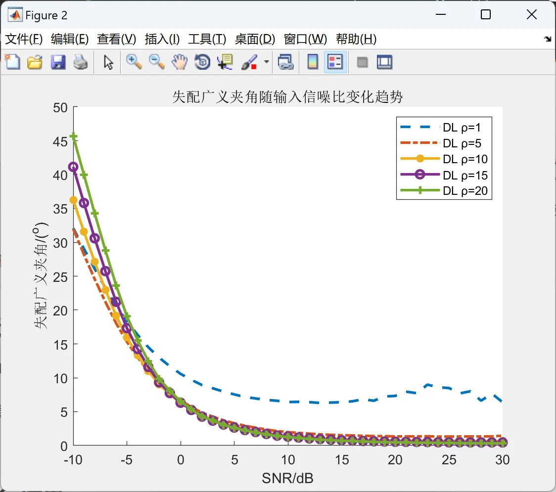 xlabel('SNR/dB');ylabel('失配广义夹角/(^o)');