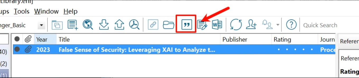 文献列表区域:占据界面的大部分空间,用于显示文献库中的所有文献记录。每条文献记录包含标题、作者、年份、期刊等信息。