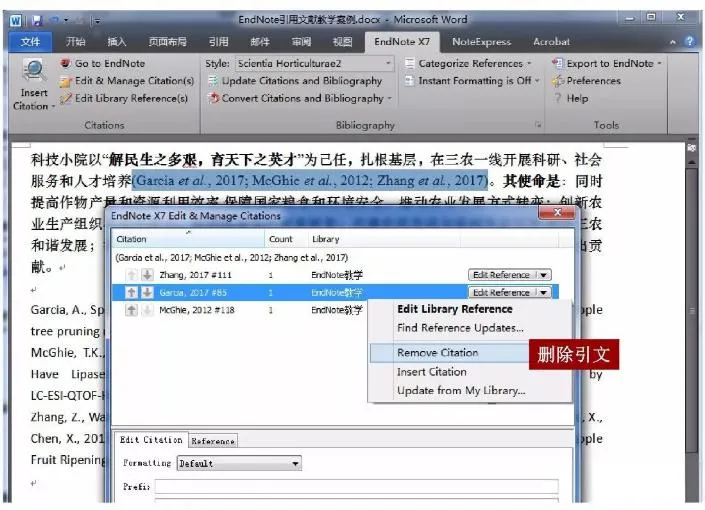 我们的文献不需要了,要删除不能直接选中键盘上的Delete按钮或者Backspace按钮。要使用工具栏上的(Edit& Manage Citations编辑和管理引文)功能。