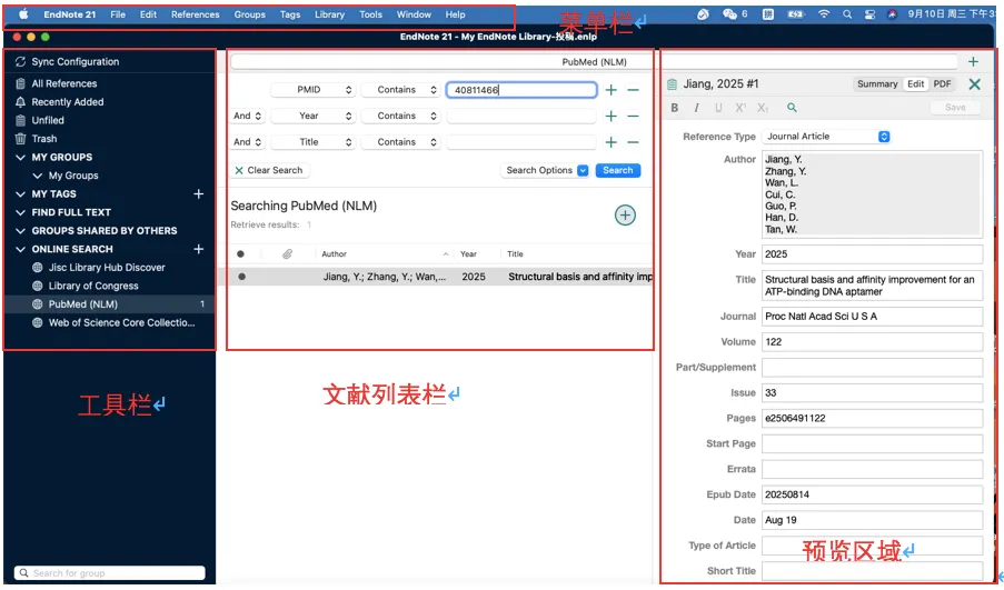 EndNote 的主界面主要分为菜单栏、工具栏、文献列表区域和预览区域。