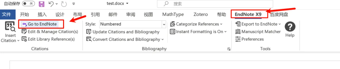 安装好EndNote软件包后,我们的Word文档就会出现一个EndNote插件(WPS是没有的), 然后我们只需要在正文后面点击Go to EndNote, 跳转到EndNote界面。