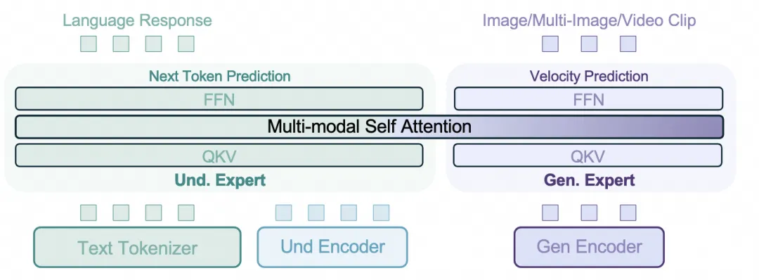 以上的串联结构是利用 Embedding 作为 AR 和 Diffusion 的桥梁,而这里的串联结构,则是将 Attention 作为 AR 模型和 Diffusion 模型的桥梁。典型的工作包括 LlamaFusion[17] 和 Bagel[18]。采用 Bagel 中的定义,可以将这个架构叫做 Mixture-of-Transformer-Experts (MoT)。
