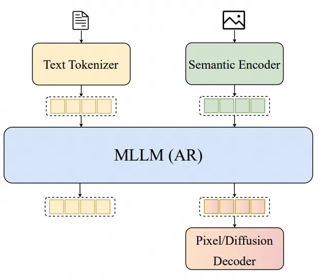 AR 和 Diffusion 分别是图像理解和生成领域的主流路线,因此可能是最简单有效的统一模型路线就是将 AR 和 Diffusion 串联起来,AR 模型完成理解任务,AR 模型的输入作为 Diffusion 的条件,完成生成任务,架构如下图所示(图源:统一模型综述 [7])。