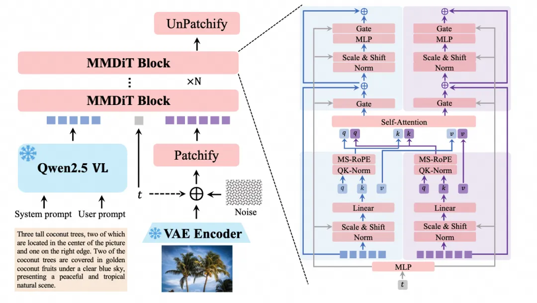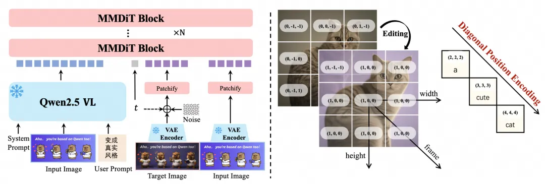- VAE 编码架构:Qwen-Image 和 OmniGen2 采用的是这种架构,目光放远,早些时候开源的 Step1X-Edit 与 Flux-Kontext 都是一模一样的架构。再把目光放远,这种架构和 In-Context LoRA 与 OmniControl 的思路是一致的。以Qwen-Image 为例,架构如下图所示。重点关注 Input Image, 它经过 VAE Encoder 后,作为条件输入 DiT中。在这个架构中,一般会使用位置编码来区分输入图像和去噪图像,像 Qwen-Image[15] 和 Flux-Kontext[16] 都是直接在位置编码的第一维(帧id)做区分。