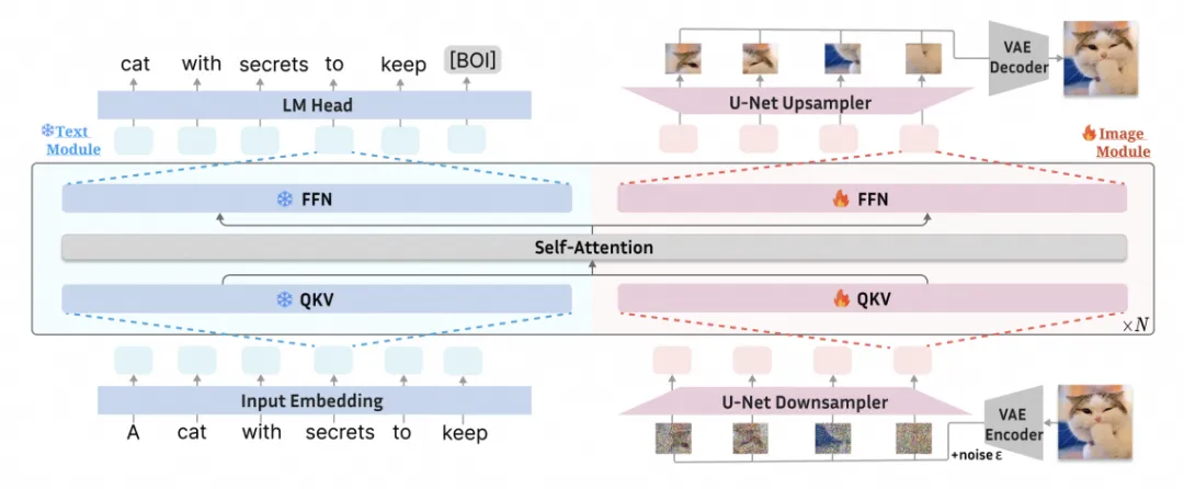 LlamaFusion 的架构如下图所示。给定一个语言模型,如下左图,作者将其参数复制一份,作为右图的图像生成专用参数。对于一个包含文本和噪声图像的序列,文本 Token 使用左图的参数计算,而图像 Token 使用右图的参数训练,但是在 Attention 的计算阶段,所有 Token 拼接到一起做 Self-Attention。由于语言模型冻住,这个架构并不能改变模型的理解能力,所以不涉及图像理解任务中的编码问题。而图像生成使用的编码和解码都是 VAE,尽管模型采用的是语言模型结构,但实际是使用 Diffusion 的路线进行图像生成。