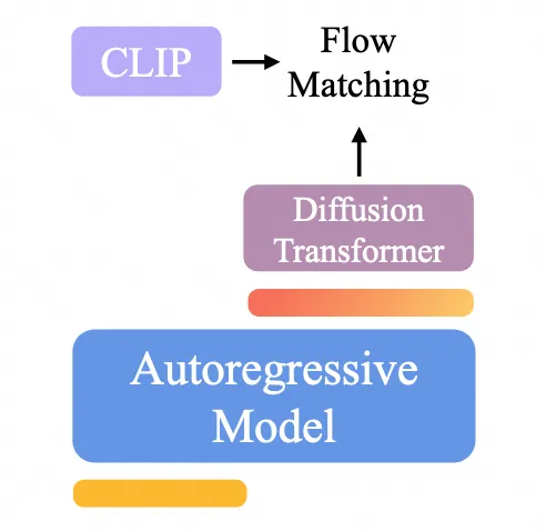 Blip-3o 也是类似 Embedding 监督训练思路,但他们额外使用 FlowMatching 来对语义 Embedding 做分布建模, 算是在这个架构中分析了自回归模型中无法做分布建模的问题。如下图所示: