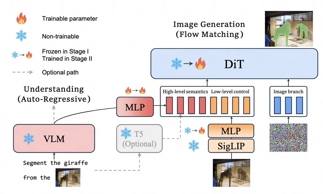 Bagel 采用和 LlamaFusion 相似的架构,不同的是,模型的图像理解和生成能力全部都是重头开始训练的。模型的图像理解采用的编码器是 SigLIP 这类语义编码的模型,而图像生成采用的编码器和解码器是 VAE 这样的重建模型。理解任务使用 AR 的方式自回归地生成文本 Token,而生成任务则采用 Diffusion 的方式生成图像的 VAE 特征。