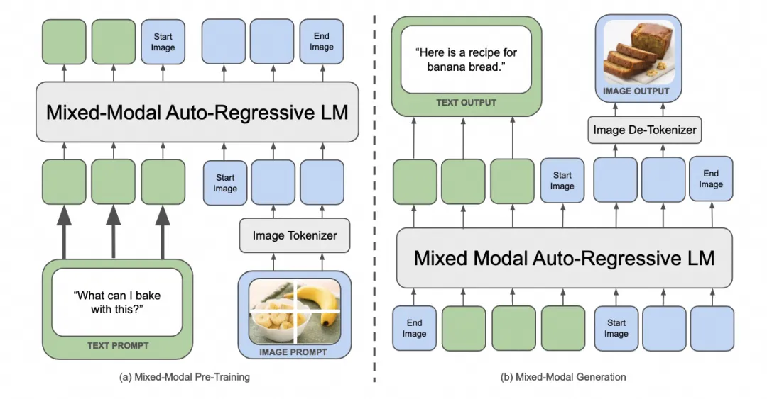 Chameleon 的模型架构如下图所示。对于图像理解任务,先使用 VQ-VAE 的 Encoder 作为 Image Tokenizer,将图像编码成离散的 Embedding,然后由自回归模型预测文本输出。对于图像生成任务,使用 VQ-VAE 的 Decoder 作为 Image De-Tokenizer,将自回归模型预测的离散图像 Token 解码成图像。