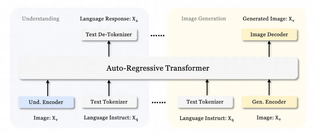 注意,本文并不是一篇完整的综述,可能不会涵盖所有文章,这四个类别是为了更好的抓住不同模型之间的差异。理解一个统一模型最快的思路就是理清它是怎么应对图像理解和生成这两个任务的。对于图像理解任务,现在的统一模型一般都是沿用 VLM 的思路,将图像编码成 Embedding 后,由 LLM 统一处理,这个路线是经过广泛验证的;不同路线方法在理解任务上的差别在于图像编码的方式。对图像生成任务的实现方式,不同模型的差异主要体现在几个方面,分别是是图像如何编码、如何生成图像编码、图像如何解码。以下每个路线我们都会重点关注这些差异点。