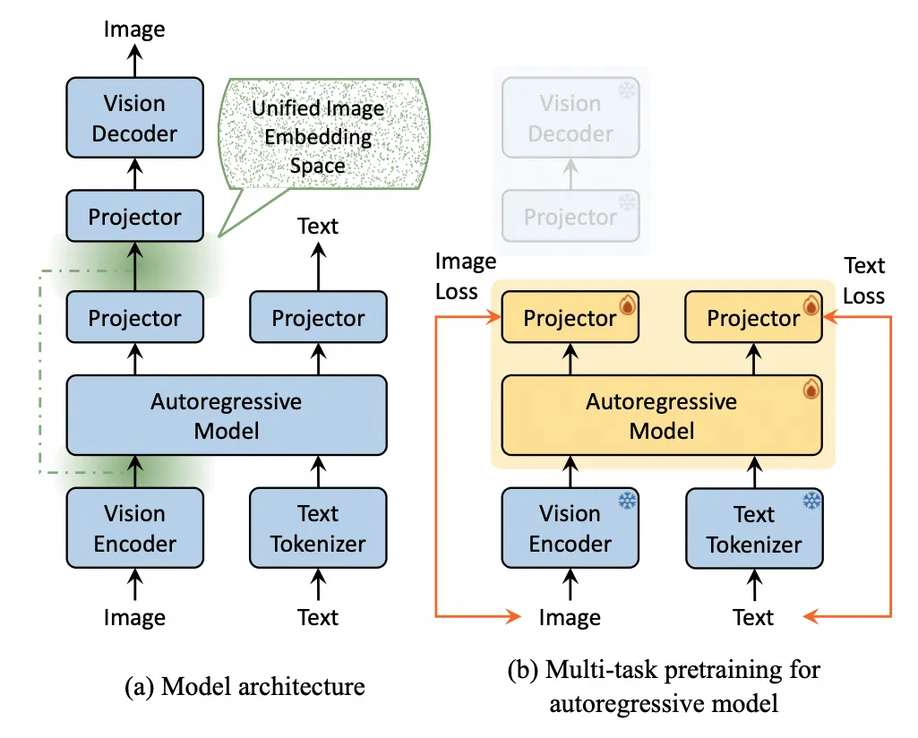 如上图b所示,MetaMorph 和 Nexus-Gen 会使用 Image Loss(一般为 MSE 或者余弦相似度损失) 来使监督 AR 模型,使其学会预测目标图像的语义 Embedding。这样做的原因一方面是想要从 Joint Training 的角度回答为什么要做统一模型,在 MetaMorph 的实验中,图像理解和生成任务一起从零开始训练能互相促进彼此的效果。另一方面,Nexus-Gen 的 Unified Image Embedding Space 将理解和生成建模成了一个逆向任务,潜在的好处是可以直接对生成的 Embedding 做理解,从而有多轮推理的潜力。