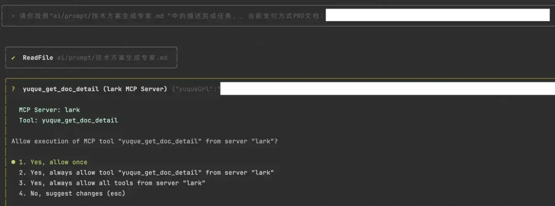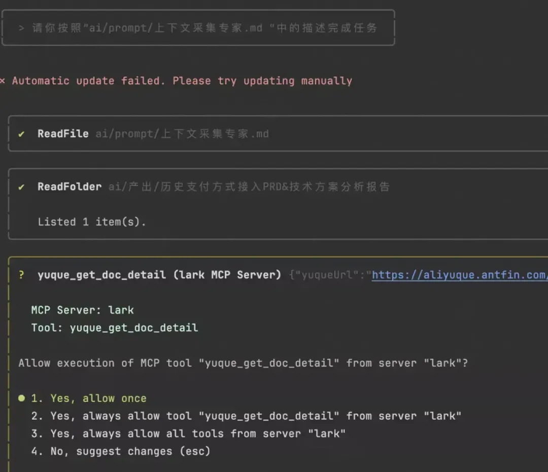 ℹ Qwen Code update available! 0.0.6 → 0.0.7 Installed with npm. Attempting to automatically update now... ╭──────────────────────────────────────────────────────────────────────────────────────────────────────────────────────────────────────────────────────────────────────────────────────────────────────────────╮ │ ? WebFetch Processing URLs and instructions from prompt: "获取PRD文档内容:https://aliyuque.antfin.com/xxx" ← │ │ │ │ 获取PRD文档内容:https://aliyuque.antfin.com/xxx │ │ │ │ URLs to fetch: │ │ - https://aliyuque.antfin.com/xxx │ │ │ │ Do you want to proceed? │ │ │ │ ● 1. Yes, allow once │ │ 2. Yes, allow always │ │ 3. No, suggest changes(esc) │ │ │ ╰──────────────────────────────────────────────────────────────────────────────────────────────────────────────────────────────────────────────────────────────────────────────────────────────────────────────╯ ⠏ Waiting for user confirmation...