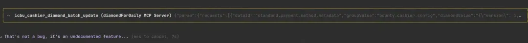 ## 🔧 MCP 工具列表(你可以调用) | MCP Server | 功能 | 调用方式 | |-----------------------|------------------|--------------------------------------------------------------| | `lark` | 读取语雀文档 | `yuque_get_doc_detail(yuqueUrl: str, token: str) -> dict` | | `aoneCode` | 分析 Git 记录 | `list_commits(repo, refName, path)` | | `diamondForDaily/Pre` | 查询/推送配置 | `icbu_cashier_diamond_batch_query`, `icbu_cashier_diamond_batch_update` |