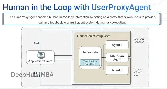 - UserProxy Agent:充当人机接口层,转发消息和响应